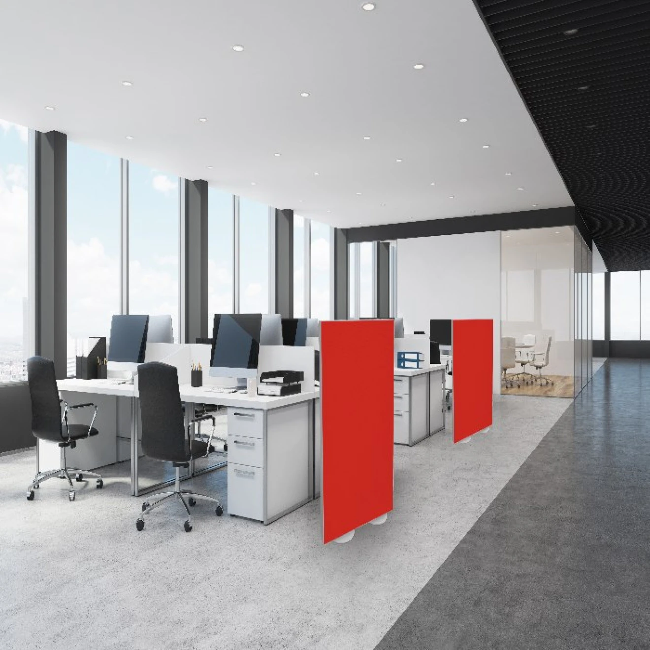 Unsere Stellwände bzw. Raumtrenner eignen sich ideal, wenn Sie Arbeitsplätze nicht nur räumlich, sondern vor allem auch akustisch voneinander trennen möchten. Dabei haben wir uns bewusst für eine optimale Höhe von 160cm entschieden, damit man z.B. im Sitzen akustisch geschützt ist, aber leicht Dokumente usw. im Stehen austauschen oder kurz mit einem Kollegen sprechen kann.